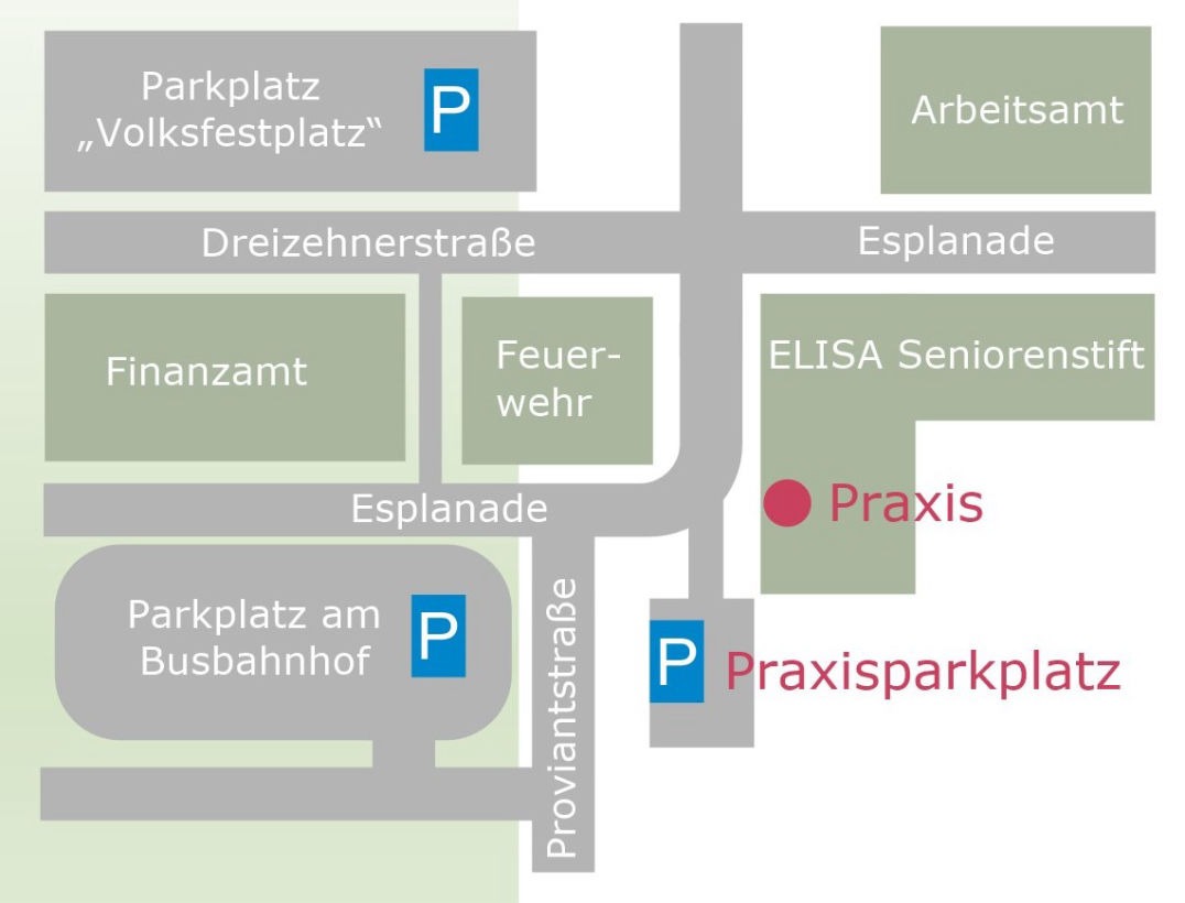 Die Praxis befindet sich zentral in Ingolstadt im Erdgeschoss des ELISA Seniorenstifts. Direkt gegenüber der Berufsfeuerwehr (nähe Busbahnhof)